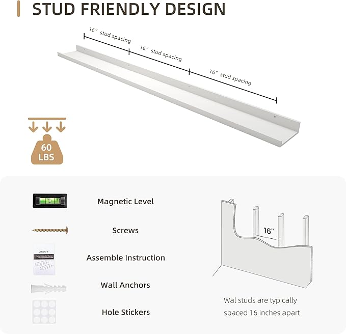 - 【Superior Quality】 Crafted from high-quality wood, each floating shelf is designed for long-lasting durability. The pre-drilled mounting holes are spaced 16 inches apart, ensuring a secure installation into wall studs.