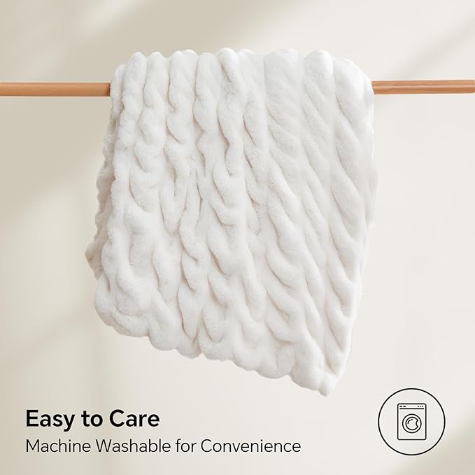 BEDELITE Faux Fur Throw Blanket for Couch, Soft and Cozy Boho Ruched Fluffy Blanket, Warm Plush Fuzzy Faux Rabbit Fur Blanket for Women Gift (Cream, 60"x 80")