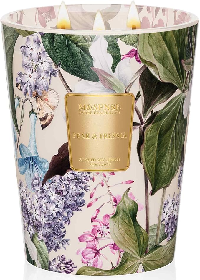 M&SENSE 3 Wick Soy Candles for Home Scented, Pear & Fressia Scented Aromatherapy Candle for Stress Relief, 35oz 150 Hour Burn Time, Long Lasting Highly Scented Candle Gift
