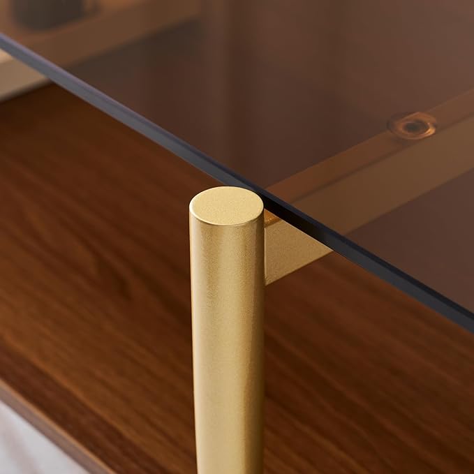 Rectangle Coffee Table, Mid-Century Modern Design, L41 W21 x H17, for Living Room, 2-Tier Structure, Amber Glass Top and Walnut MDF Shelf, Sleek Conical Metal Legs with Gold Finish