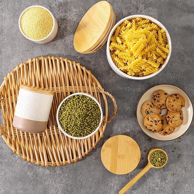 - 【High-quality Material】-The canisters are made of high-quality terracotta, which is not easy to crack and mold and is more durable than plastic and glass. The lid is made of bamboo wood, with an environmentally friendly sealing rubber ring to improve the sealing. Effectively keep the items dry and fresh.