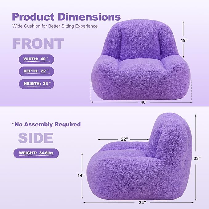 - No Assembly: This sherpa accent chair is pre-filled,you don't need to fill it yourself. It is shipped compressed and will expand right after you open the package. Simply cut the package open and enjoy the amazing bean bag sofa,saving you time and effort, enjoying it at once. If you have any questions, please do not hesitate to contact us, we are at your service 24 hours a day!