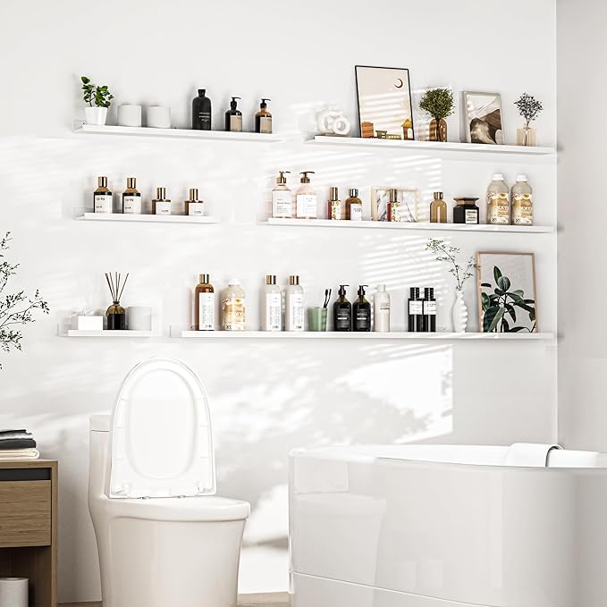 - Picture ledge Shelf for Walls: If you have dozens of pictures but don't know how to display them, Heimlove picture ledge shelves(especially large size) for walls are perfect! With our hanging shelves, store and display different types and sizes of photo frames in one place. The ledge in front of the wall shelves could prevent your precious items from falling off.