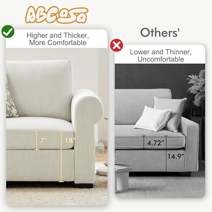 - HIGHER AND THICKENED SEAT - The seat height of the sofa is 18 inches, in comparison to similar products on the market, we have increased the height by approximately 25% in comparison to them.The seat cushion is 7 inches thick and made of high-quality foam with high-grade spring padding. It provides both support and a comfortable seating experience, with a medium firmness level (3 out of 5).