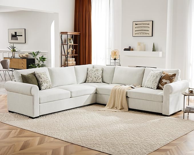 L Shaped Sectional Sofa with Ottoman,Rolled Armrest,Modern Sectional Modular Couch for Living Room,Breathable Linen Fabric Corner Couch with 7 Seats for Apartment,Removable Sofa Cushion,Ivory