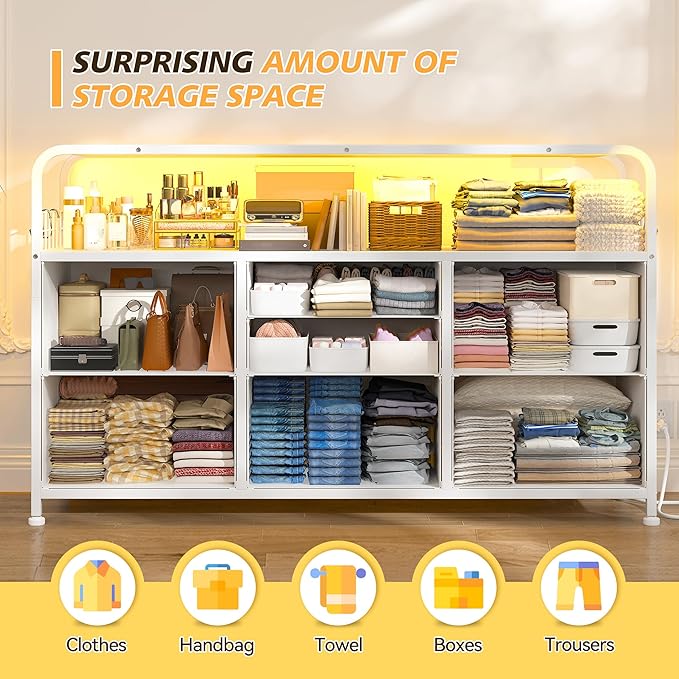 - 【Safety Power Outlet & LED Lights】Equipped with 2 power outlet & 2 ports, this bedroom dresser offers convenient charging for your TV, gaming equipment, and other electrical devices. The led lights work flawlessly with remote, comes with various color options and flash options, you can freely adjust the colors to a nice ambiance according to any scenario