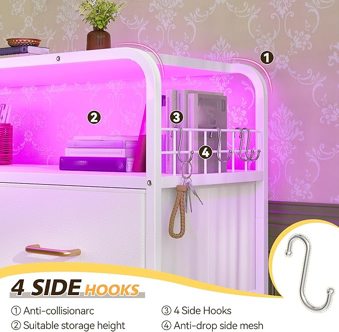 TV Stand for Bedroom with LED Lights & Charging Station, 7 Drawer with Open Shelf, Media Console for Living Room & Chest of Drawers for Closet, Entryway, Hallway, 4 Hooks, White