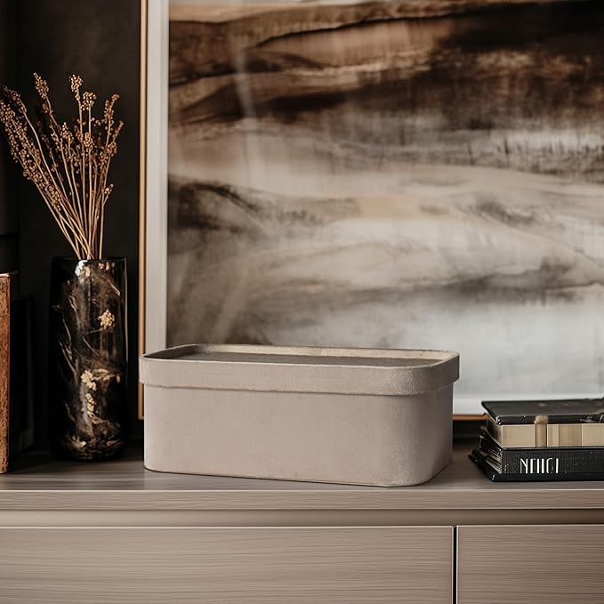 La Jolie Maison Velvet Storage Baskets with Lids, Sturdy Stackable Cardboard Boxes with Decorative Trays, Organizer Bins for Bathroom Bedroom Organizing, Taupe, Set of 3
