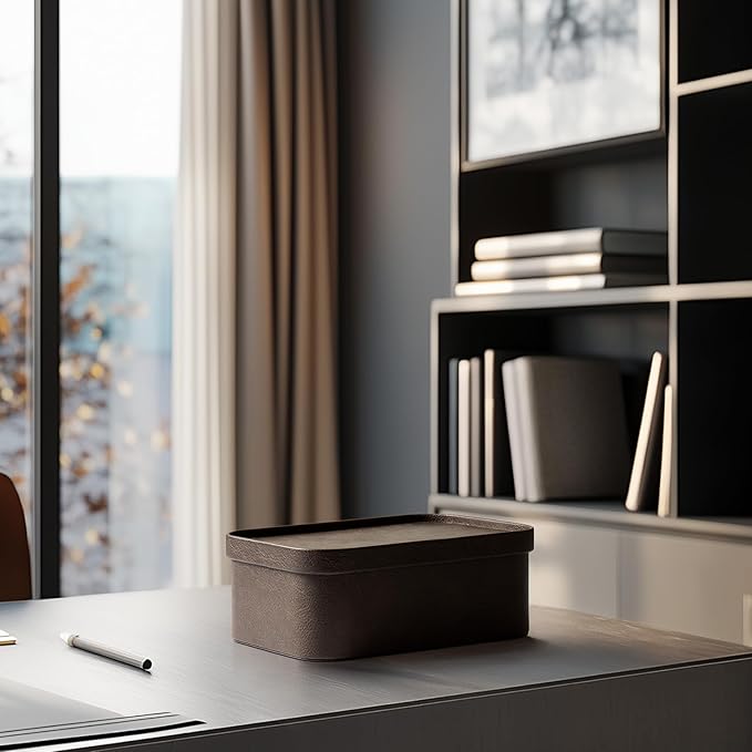 - SUSTAINABLE STYLE MEETS URBAN CHIC: Unleash your inner design maven with our game-changing storage boxes. Dressed in a luxe mocha vegan leather that screams sophistication, these eco-friendly beauties are more than just storage—they're a lifestyle statement. Crafted from premium MDF and wrapped in buttery-smooth vegan leather, these boxes are your ticket to clutter-free, Instagram-worthy spaces