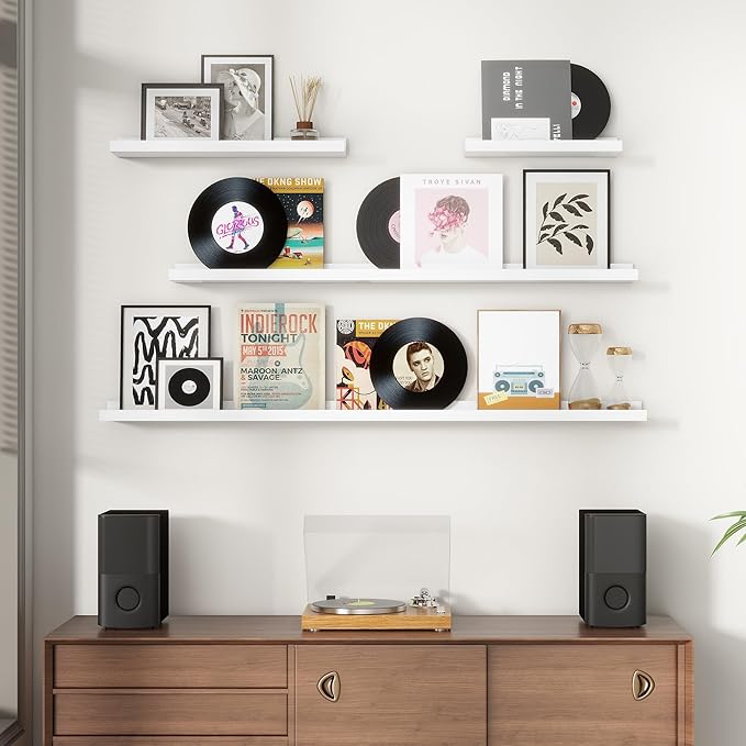 - Picture Ledge Shelves: The ledge in front of the wall shelves could prevent your precious items from falling off. And we handcraft a shallow groove on each book shelf to protect your items from sliding forward. Each floating shelf is 5 inches in depth with a 1.25 inches lip, you can put photos, pictures, DVD players, videos, books, toys, and some other knickknack on this beautiful display wooden shelf