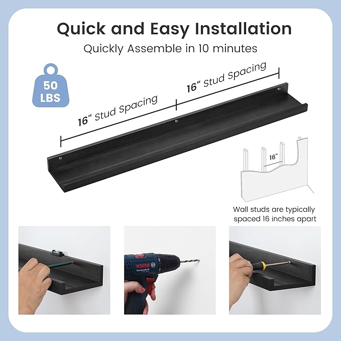 - Easy to Install: You will get a level, screws for the wall, drywall anchors, a detailed installation guide, and two beautiful hand-crafted solid pine wood shelves. With the level, you can make sure your picture ledge shelves are well aligned. Just follow the simple instruction to install the hanging shelves for wall decor within 10 minutes. We add additional screw and anchor to the hardware bag just in case. If you have any questions about our products, please feel free to contact us