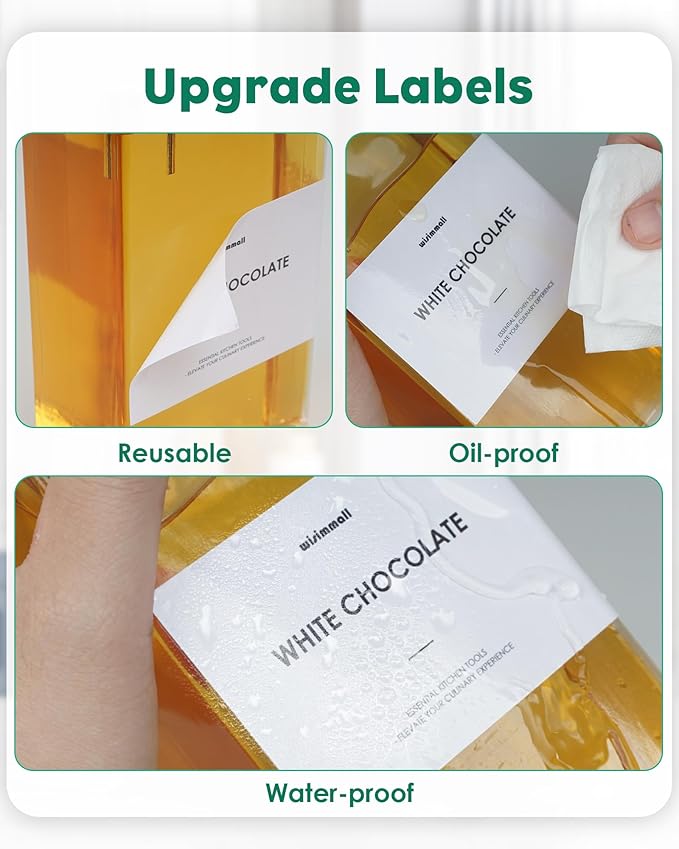 - [Labels Free of Oil Stains]: Each set has 35 complimentary waterproof stain-free labels(for oils, coffee syrups and cooking sauces) with 5 DIY blank labels. the labels are designed to be reused and will not leave any residue upon peeling.