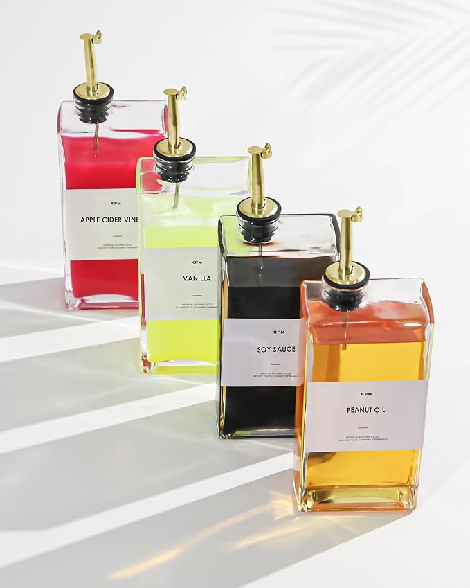 - [17OZ/500ML Large Capacity Oil Dispenser Set]: With elegant rectangular olive oil dispenser bottle set enhance your kitchen decor also very pragmatic. This set includes two high-quality 17 oz (500 ml) glass bottles, four gold pourers, a funnel, and 35 designed labels and 5 blank labels for your custom use.