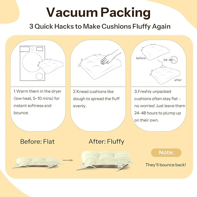 - Large Size Design: Our kitchen chair cushions set of 4 measures 18" x 18" x 3", perfect for most dining chairs, kitchen chairs, and office chairs, instantly transforming hard seats into cozy, stylish seating solutions for any room. The chair cushions for dining chairs are vacuum-packed for shipping. Upon receiving them you can simply follow the easy steps to fluff it for optimal comfort.