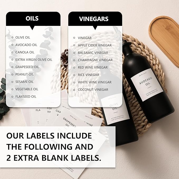 - KITCHEN OLIVE OIL DISPENSER BOTTLES – The oil and vinegar dispenser set contains 2 black 16oz (500ML) glass bottles, 2 black stainless steel oil spouts, 17 waterproof labels(kinds of oil and vinegar) and a bamboo tray, Ideal for safely store and dispense your olive oil and vinegar.