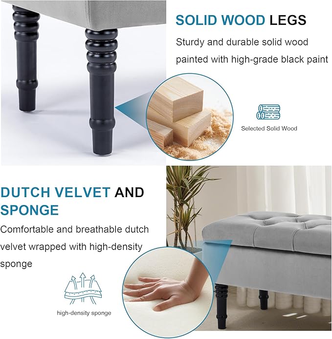 - Premium Materials: This bench is made of skin-friendly velvet, soft and comfortable to the touch. The seat cushion of the storage bench is equipped with high-density sponge, which is not easy to deform after sitting for a long time, allowing you to experience a comfortable sitting experience.