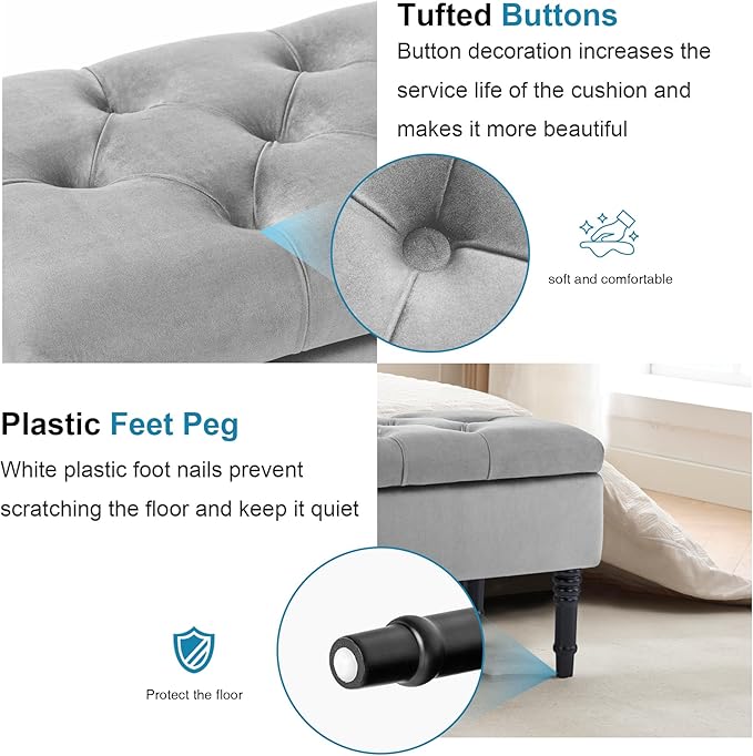Ottoman with Storage Velvet Storage Bench Holds Up to 500 lbs Ottomans Upholstered Bench with Seating for Bedroom, Living Room, Grey