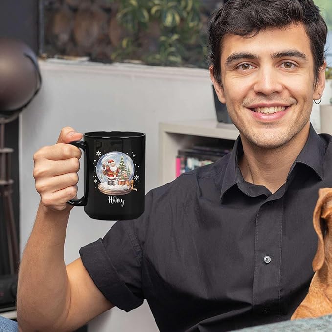 - 💝 UNIQUE DESIGN MUG: Bring holiday joy with this "Custom Snow Ball Design Mug With Name" featuring a festive Santa inside a sparkling snow globe with gifts and a Christmas tree. Click "Customize Now" to personalize with a name and create a unique gift for spreading holiday cheer. This black ceramic mug is ideal for enjoying your favorite seasonal beverages.