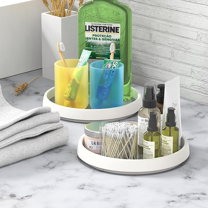 "Coordinated dispensers, toothbrush holders, trays, and storage accents that declutter the counter...