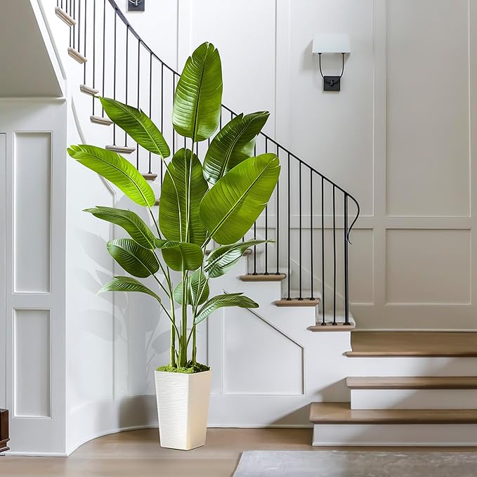 Lifelike Bird of Paradise Silk Artificial Plant Faux Banana Leaf Tree for Home Decor - Perfect Indoor Floor Plant with 11 Trunks (1, White Tall Planter, 6.6 FT)