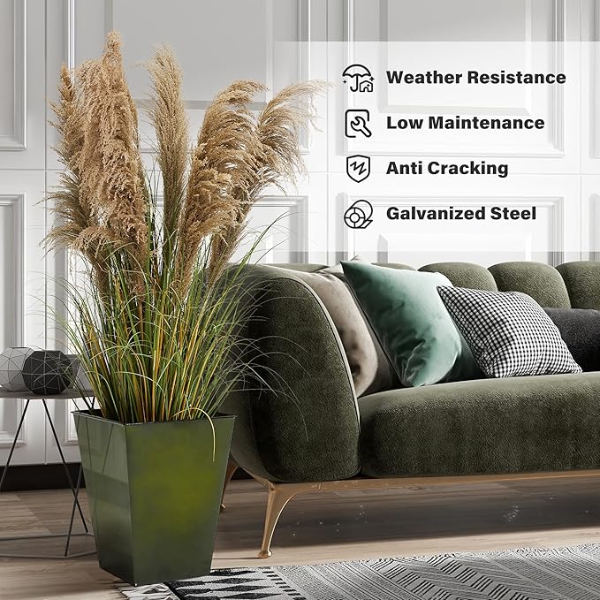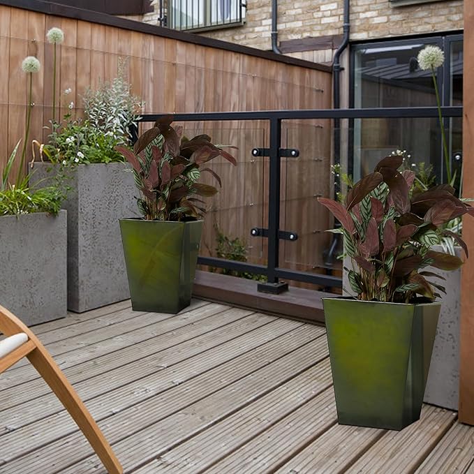 KOL 18''H. Bright Glazed Planter with Drainage Hole, Set of 2, Galvanized Steel Planter Pots for Indoor & Outdoor Use, Decorative Flower Plant Pots for Front Porch, Patio, Deck - Green