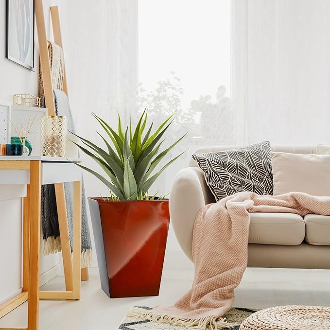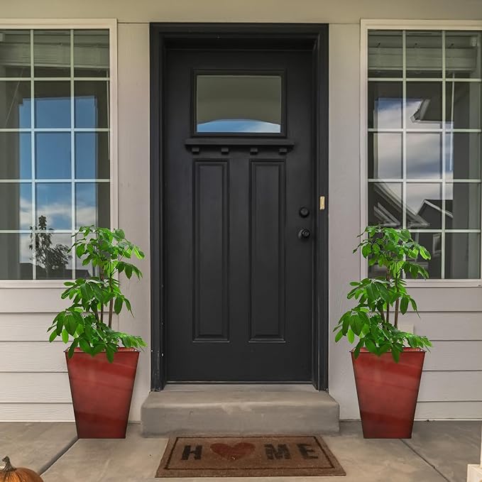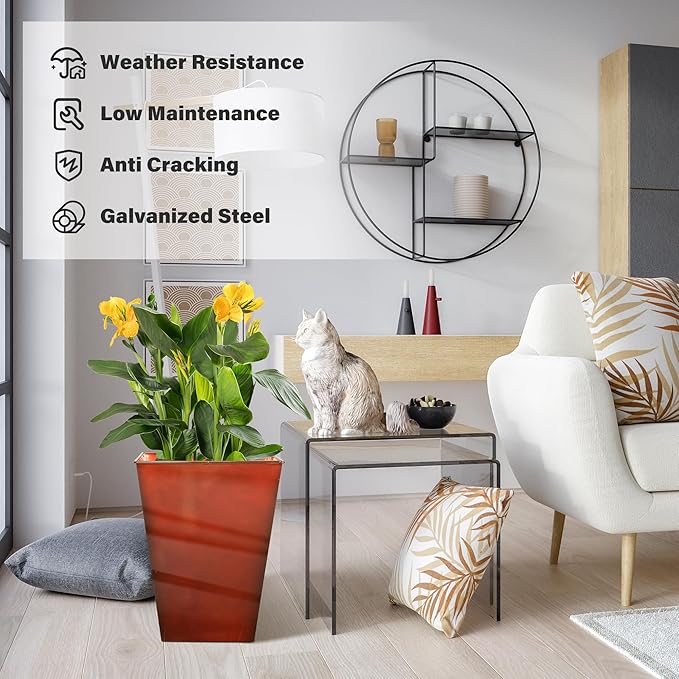 KOL 18''H. Bright Glazed Planter with Drainage Hole, Set of 2, Galvanized Steel Planter Pots for Indoor & Outdoor Use, Decorative Flower Plant Pots for Front Porch, Patio, Deck - Reddish Brown