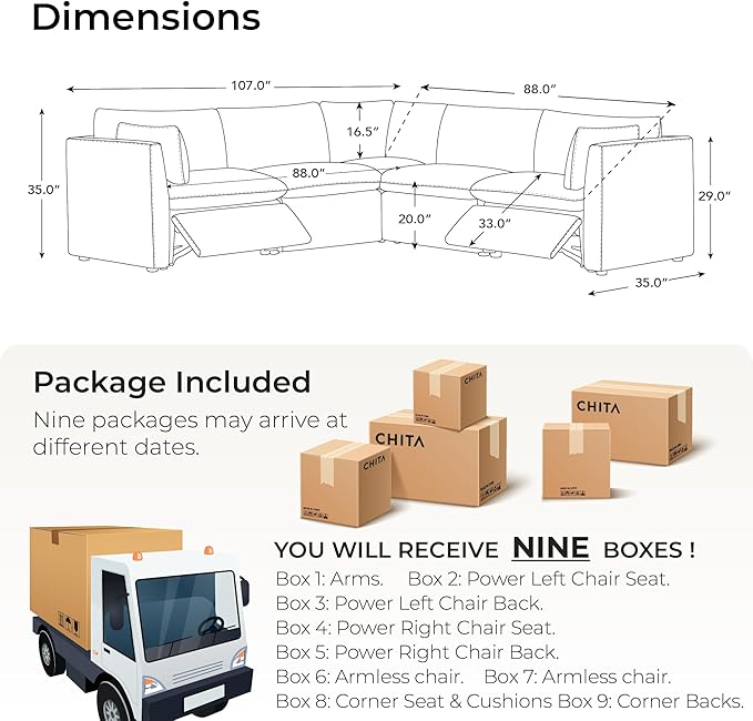 - Nine Packages - The 5-PC modular sectional with 2 power comes with 9 boxes and may arrive on different dates. Each box is designed and packaged to maximize shipping efficiency and fits narrow staircase and elevator. Minimum door width: 20'' Box 1: Arms Box 2: Power Left Chair Seat Box 3: Power Left Chair Back Box 4: Power Right Chair Seat Box 5: Power Right Chair Back Box 6: Armless chair Box 7: Armless chair Box 8: Corner Seat & Cushions Box 9: Corner Backs