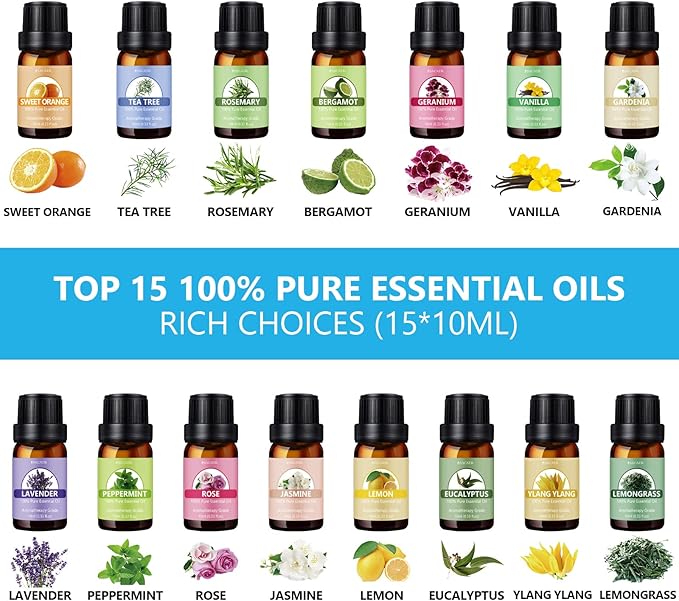 - 【15 Essential Plant Oils】❤ TOP 15 natural essential oils. The dark bottle will help keep the oils fresh and also guard against light degradation. No harsh ingredients, No additives, NO fillers. We value safety, quality in offering the high quality aroma oil products. There is an essential oil instruction manual in the packaging box for you to use these 15 natural essential oils.