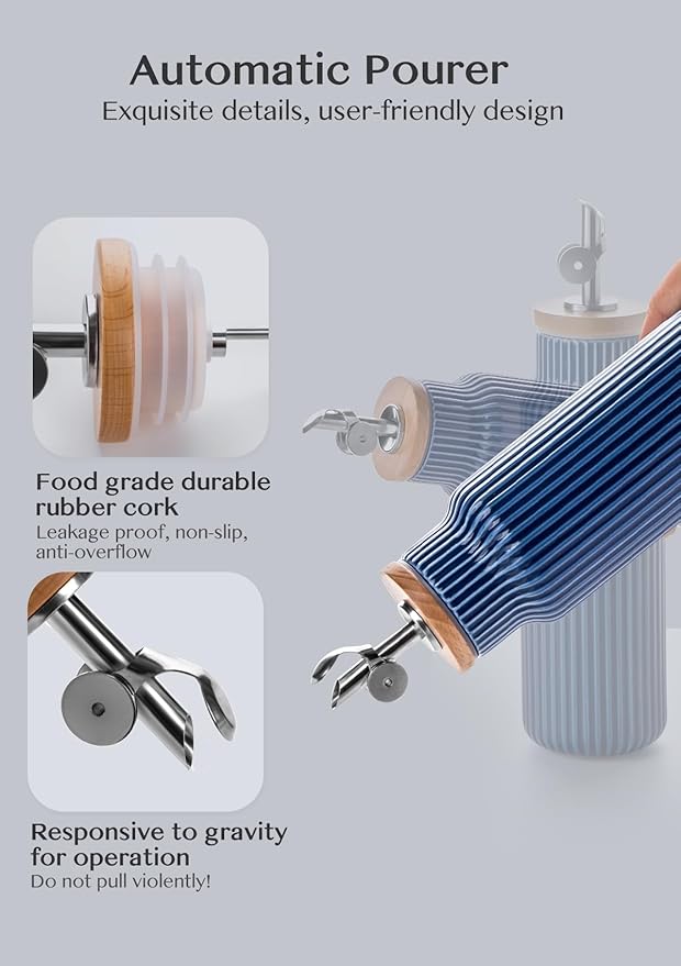 - Gravity-Driven Auto Spout: The gravity-driven spout opens automatically when the bottle is tilted and closes when it is upright, offering precise pouring control without drips or spills. Simplify your kitchen with this multi-use oil and vinegar dispenser bottle.