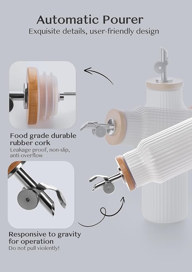 - Gravity-Driven Auto Spout: The gravity-driven spout opens automatically when the bottle is tilted and closes when it is upright, offering precise pouring control without drips or spills. Simplify your kitchen with this multi-use oil and vinegar dispenser bottle.