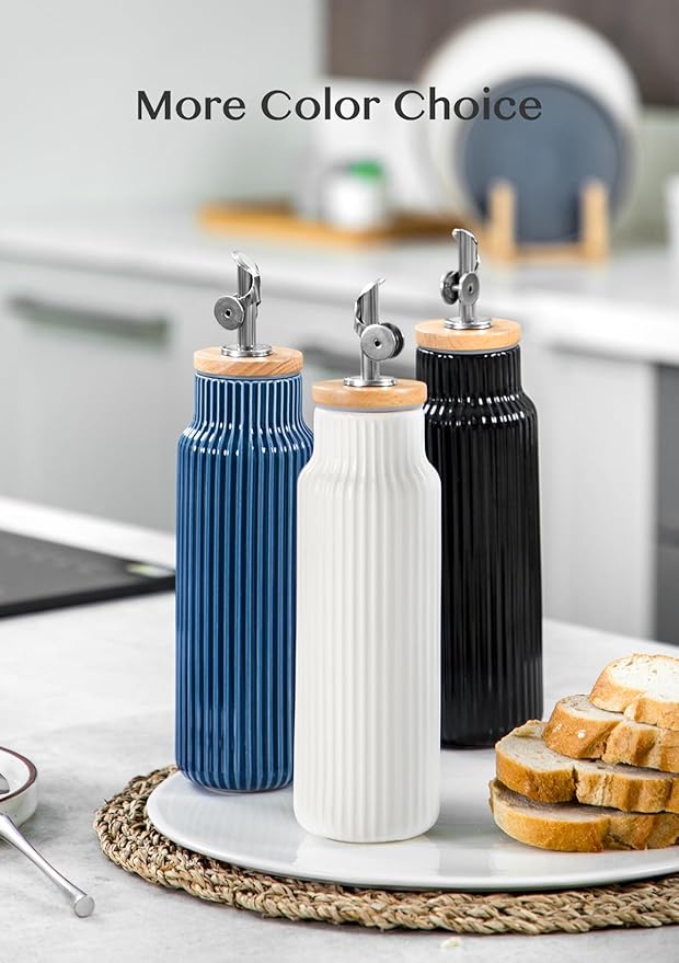 - Stylish Design & Versatility: Our 14oz ceramic oil dispenser bottle features a striped exterior for a secure, comfortable grip, making it easy to handle and slip-resistant. Ideal for olive oil, it's also great for vinegar, coffee syrups, and other cooking liquids.
