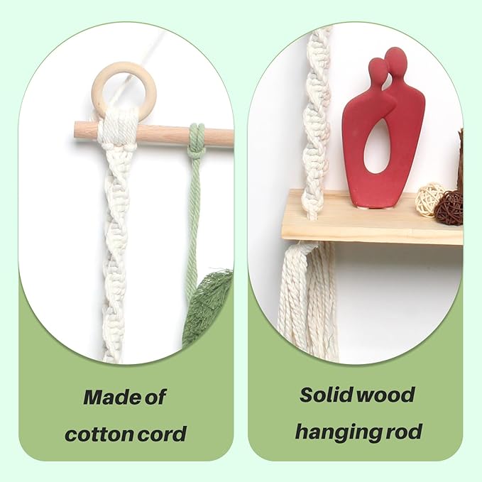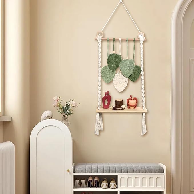 - 【Chic Style】:This macrame wall hanging decor is leaf-shaped,simple and elegant design,suitable for a variety of decorative styles, macrame wall shelf organizer can be used as a plant stand,room wall shelf for collectibles,photos,candles and books. Can add a sense of layering and warmth to your space, and bring you a better quality of life.