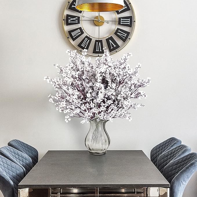 - [PACKAGE & SIZE]: The package has 10 babys breath (no vase included) packed in a box, adequate enough to match many holiday ornaments and satisfy your diverse. The real touch fake silk flowers have a total length of 19in. Each piece has 5 item parts, allows you to decorate your space easily.