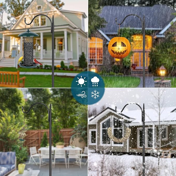 - Strudy & Durable: The short shepherds hooks for outdoor are constructed with high quality iron pipes and it features excellent rust resistance, water resistance and weather resistance. The plant hanger is equipped with a 5-prong stable base, which effectively enhances grip to ensure the hook does not tip over easily when hanging items