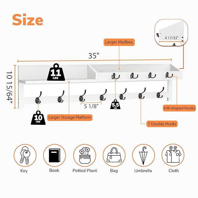 AMBIRD 35 inch Coat Rack Wall Mount, Extra Long Coat Hooks Wall Mount, Entryway Shelf with 7 Dual Coat Hooks 4 Key Hooks Mail Organizer, Wooden Wall Coat Rack with Hooks, Key Holder Rack (White)