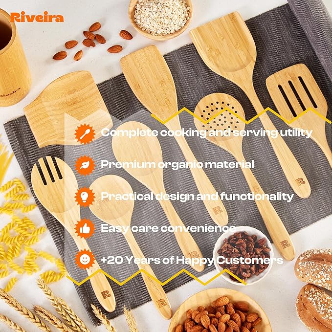 Riveira Natural Bamboo Wooden Cooking Utensils Set of 9 Premium Quality Non-Toxic Wooden Spoons and Spatulas for Cooking