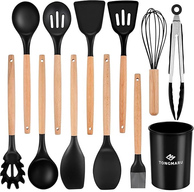 Silicone Cooking Utensils Set, Premium Beech Wood Handle Kitchen Gadgets Utensil Set, Non-Stick Kitchen Utensils Spatula, Tongs, Turner, Whisk, Brush, Spoon, BPA FREE, 446°F Resistant (Black)