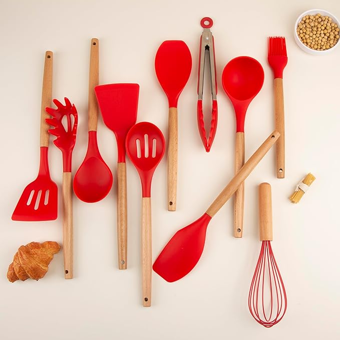 Silicone Cooking Utensils Set, Premium Beech Wood Handle Kitchen Gadgets Utensil Set, Non-Stick Kitchen Utensils Spatula, Tongs, Turner, Whisk, Brush, Spoon, BPA FREE, 446°F Resistant (Red)
