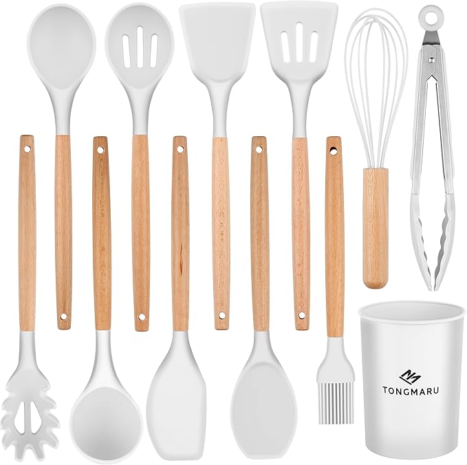 Silicone Cooking Utensils Set, Premium Beech Wood Handle Kitchen Gadgets Utensil Set, Non-Stick Kitchen Utensils Spatula, Tongs, Turner, Whisk, Brush, Spoon, BPA FREE, 446°F Resistant (White)