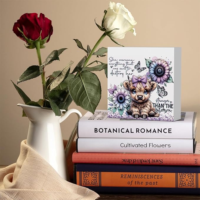 Cute Highland Cow Baby Decor, Highland Cow Sunflower Decor, Highland Cow Gifts for women, Highland Cow Nursery Decor, Wooden Box Decor Sign for Home Farmhouse Office Living Room Table Shelf