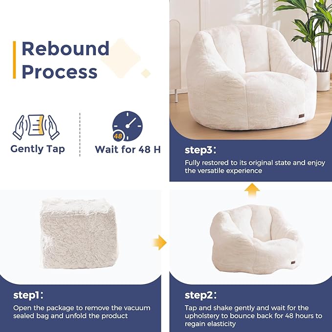 - Please Note: The bean bag chair is pre-filled, you do not need to fill it yourself. It is shipped compressed and needs time to rebound, tapped and shaken to promote recover speed, and waited about 48 hours to return to its original shape