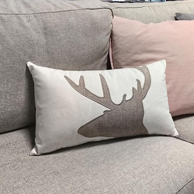 Lumbar Pillow Covers 12x20 Inches Deer Decorative Cotton Linen Deer Head Throw Lumbar Waist Embroidered Cushions Covers for Couch Sofa Bedroom White
