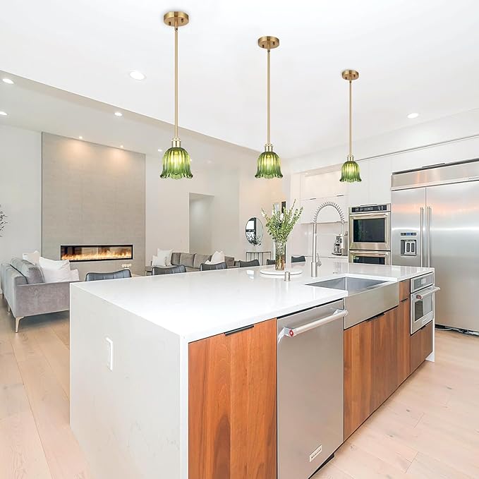 Modern Gold Pendant Light Brushed Brass Mid Century Chandelier Green Glass Shades Adjustable Rods Farmhouse Ceiling Hanging Lighting Fixture Kitchen Island Dining Room Bedroom