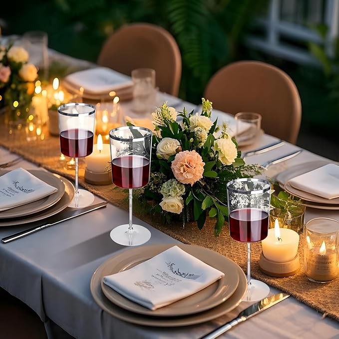 - Sleek and Stylish Design: This plastic wine glasses with stem exudes elegance and sophistication with its silver rim. Disposable wine glasses perfect for both casual and formal occasions. This plastic wine glasses disposable's sleek design ensures that you'll make a stylish statement.
