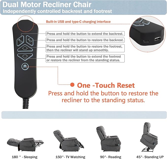 - 【Convenient Home Button, USB and Type-C Charger】We upgraded the remote control to make our chair more convenient to operate. The new remote control is equipped with USB port and Type-C charging interface and a Home button. Simply press and hold the Home button to reset the chair to a standing position within 15 seconds. You can release the button at any time to keep the chair in the position you need.