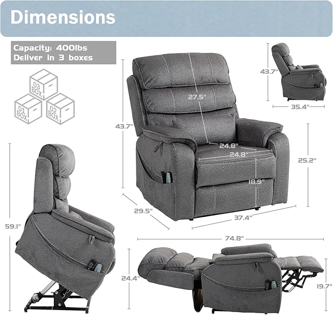 - 【Extended Footrest】This is a upgraded power lift recliner. We have extended the footrest so that you can stretch your body at full length and still have your feet well supported without cutting off circulation. Overall size: 37.4"D x 35.54"W x 43.7"H. Heavy duty steel mechanism is designed to support up to 400lbs. Suitable for big and tall people.