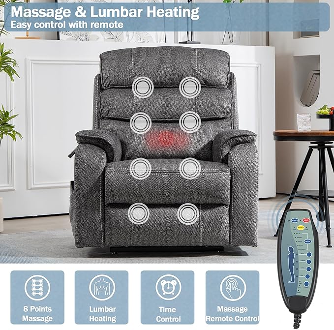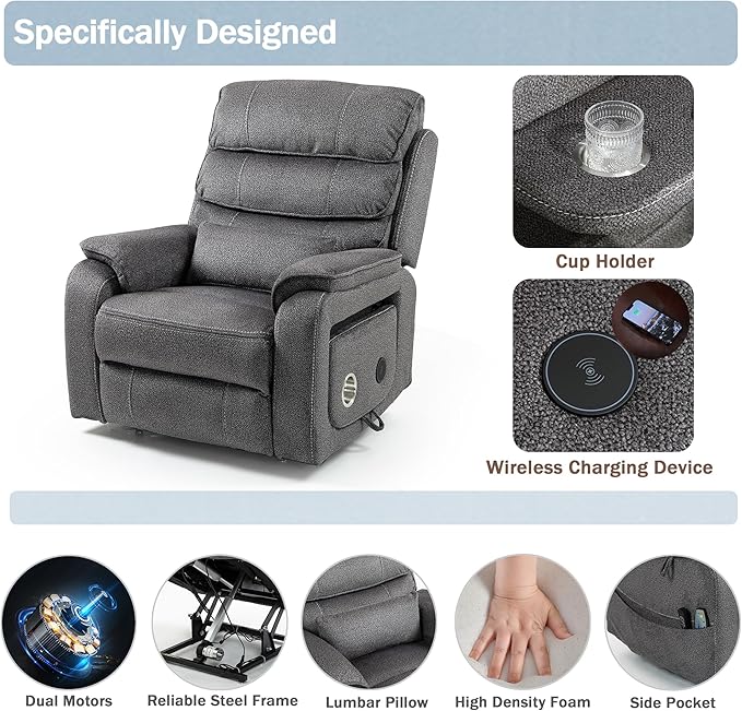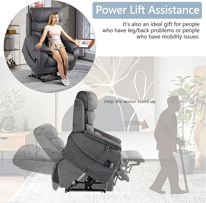 - 【Power Lift Assistance】Excellent lift chairs for elderly and adults. Counter-balanced lift mechanism to assist the senior stand up easily, smoothly adjust to lift or reclining position you prefer by pressing buttons (Recliner chair max reclining angle: 180°). It's an ideal gift for people who have mobility issues,looking for extra comfort.