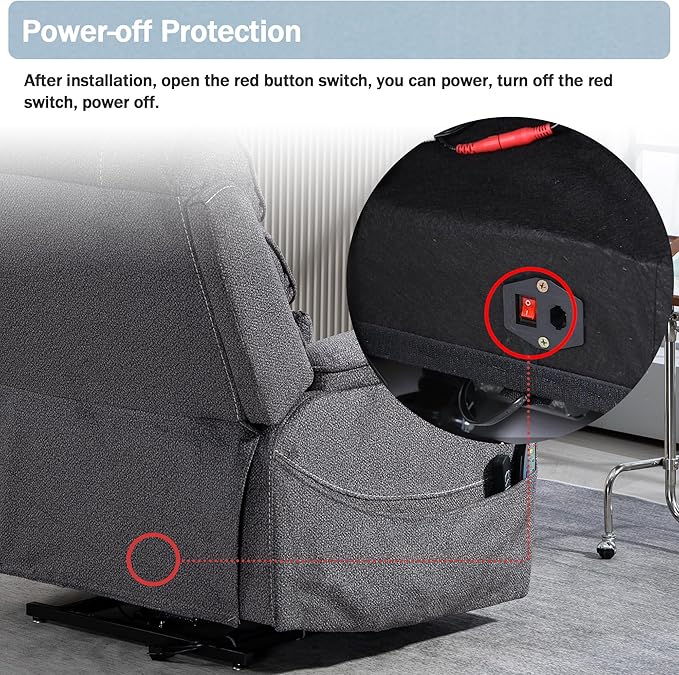 - 【Power Outage Protection Device】 When you don't need to use the chair, you don't need to unplug the power plug, just turn off the power switch on the base at the back of the chair to achieve the power-off effect.