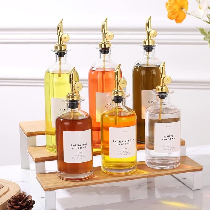 - Modern Kitchen Essential: Minimalism Inspired Cooking Oil Dispenser Bottle. This Set Includes Two High-quality 16.9Oz (500 Ml) Glass Bottles, Four Gold Pourers, a funnel, and a 36 Label Set.