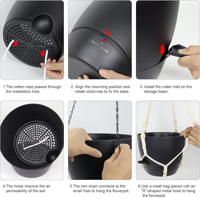 - 【Self-Watering Hanging Planter with Removable Tray】This hanging flower pot comes with a detachable bottom tray that acts as a water reservoir, holding a good amount of water. When your plant needs water, it’s absorbed through cotton wicks from the reservoir to the soil, reducing how often you need to water